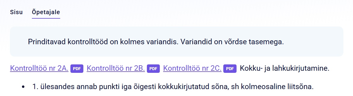 Valmis ülesandekomplektid teadmiste kontrolliks. Kontrolltööd asuvad vastava peatüki õpetaja vahelehel. Kontrolltöid sisaldavad peatükid on märgitud Drive’i töökavas.