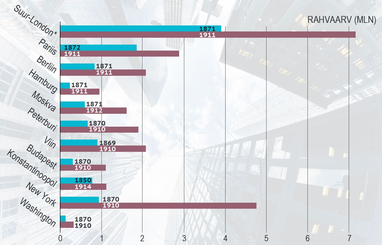 Euroopa ning Türgi ja USA suurlinnade elanike arv sajandivahetusel.